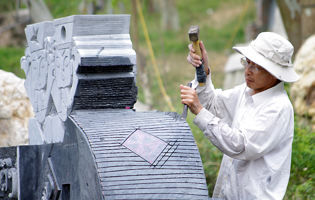 Sau khi xong phôi tượng, nghệ nhân dùng phấn hoặc bút chì đánh dấu chính xác lên đá, sử dụng các dụng cụ khác như đục răng cưa để chỉnh hình, tạo ma che cho tượng. Lúc này, nghệ nhân dùng búa và đục với lực nông và tinh tế hơn.